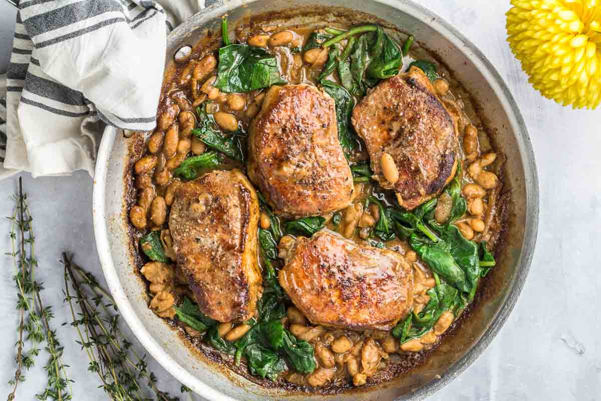 Pork Chop Skillet Dinner with Spinach and White Beans
