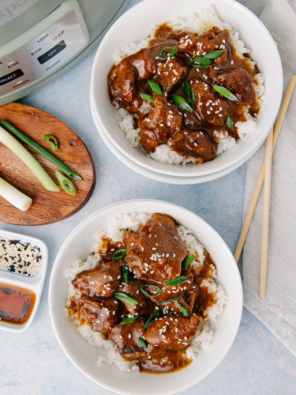 It’s a simple slow cooker dinner that comes together with just a few minutes of prep. I usually serve it over rice with a handful of green onions and sesame seeds on top. It reheats well, too, so the leftovers are perfect for the next day’s lunch.