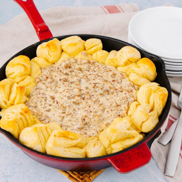 Serve the biscuit and gravy bake right in the skillet as your centerpiece, then add one or two easy extras like a fruit salad or a pan of Sticky Buns that guests can grab as they mingle.