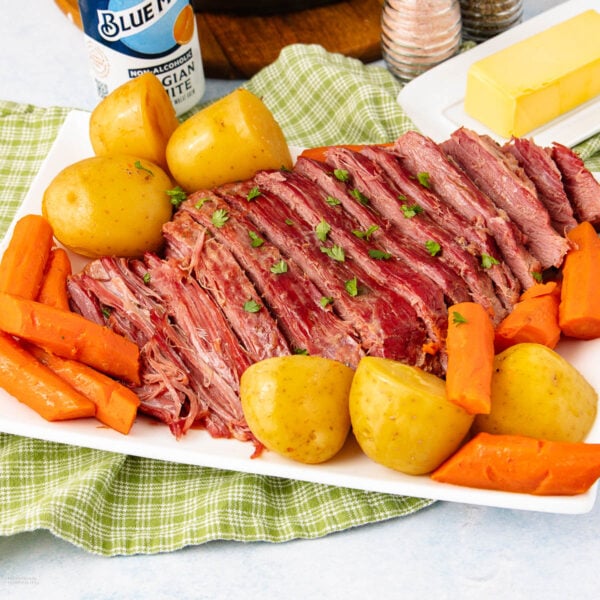 Instant Pot corned beef with no cabbage is a simple way to get tender, sliceable brisket without worrying about overcooked vegetables. For this recipe, I cook the beef first in broth, beer, garlic, and spices, which builds rich flavor and tender, slicable meat. Then, the next quick step is cooking the veggies in all those great brisket juices.
