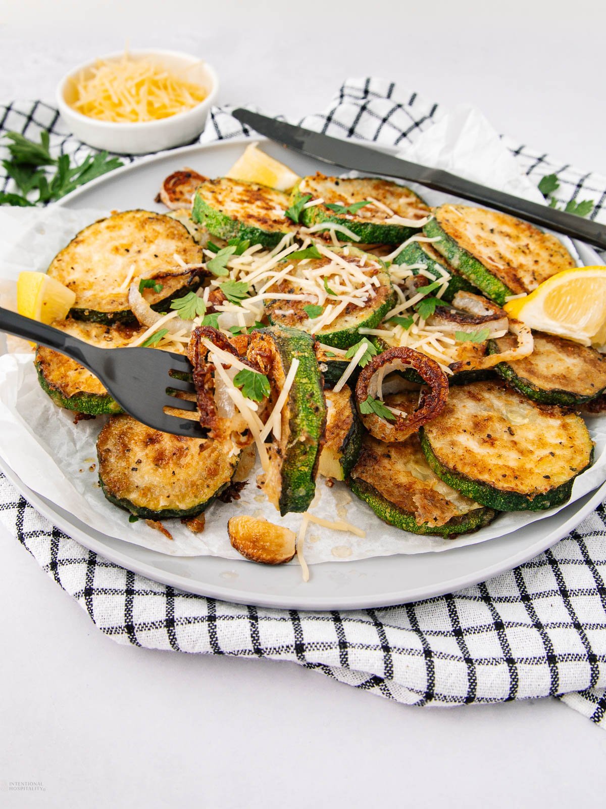 Finish and serve: Transfer the zucchini, onions, and garlic cloves to a serving plate. Sprinkle with Parmesan cheese and chopped parsley, then squeeze lemon wedges over the top. Serve hot and watch them disappear fast.