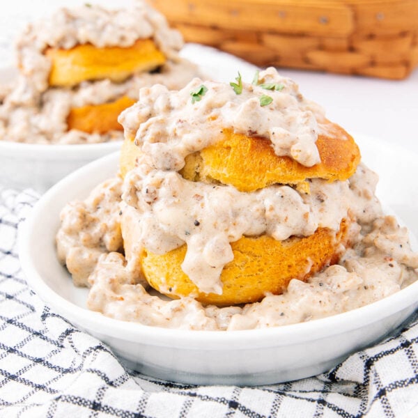 Reheat: Warm the gravy gently on the stove with a splash of milk to loosen. Reheat biscuits in the oven or microwave.