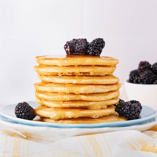 - Stack pancakes on a plate and serve warm with syrup, berries, and a dusting of powdered sugar, if desired.