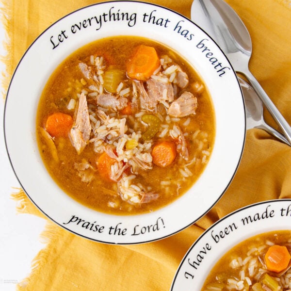 Share this easy turkey and rice soup with someone outside your home. Prepare a small “extra bowl” kit with a container of soup, some slices of warm bread like 7-Up Biscuits or easy 2 Ingredient Biscuits, or Fiercracker Saltines. Tuck in a few Soft Gluten Free Peanut Butter Cookies for a sweet finish. This is perfect for someone going through a hard time that you might be aware of. It makes them feel loved without pressure. As you offer it, keep Mark 12:31 ESV“You shall love your neighbor as yourself. There is no other commandment greater than these.”